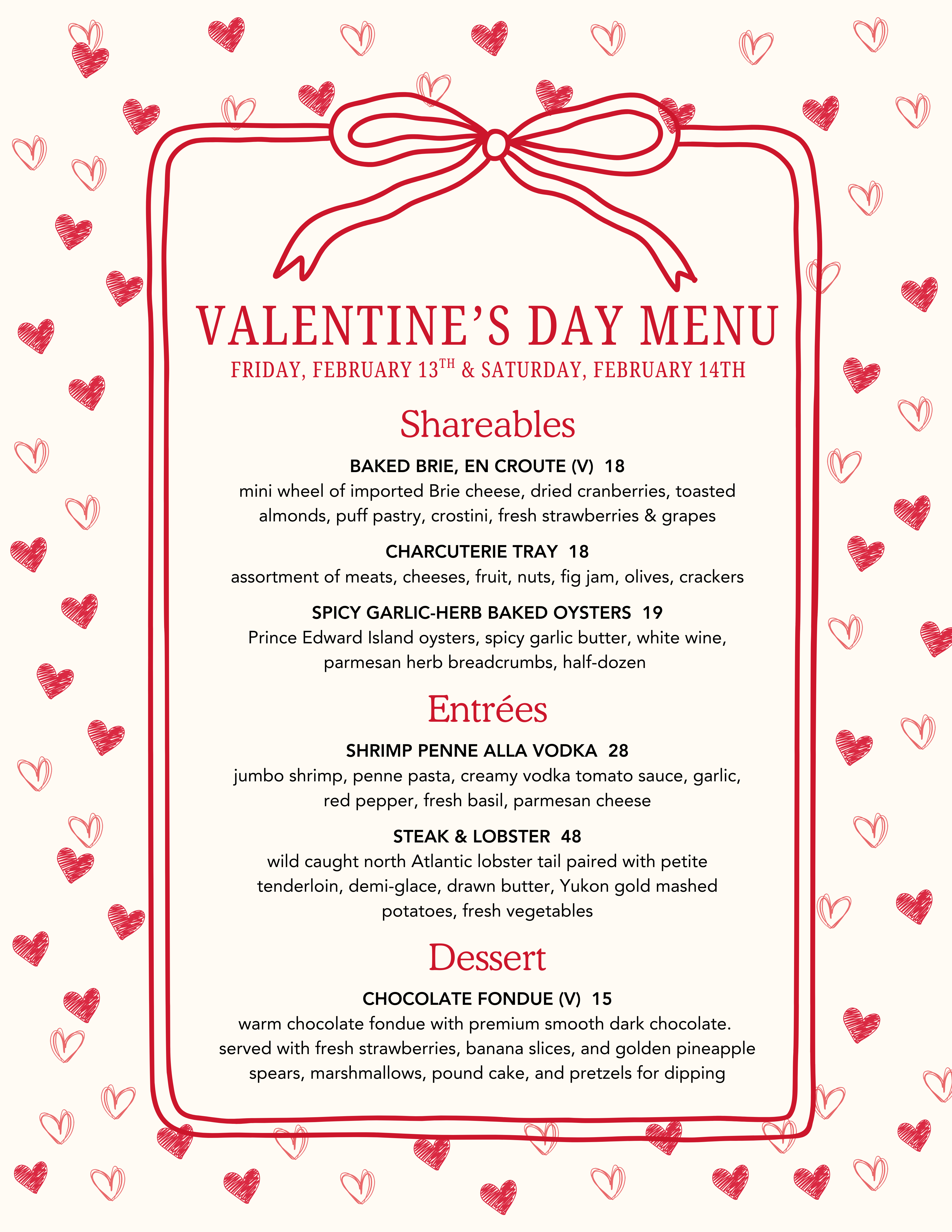 Celebrate Galentine’s or Valentine’s Day with a memorable night in our restaurant—great food, cozy ambiance, and the kind of moments best shared with your favorite people.